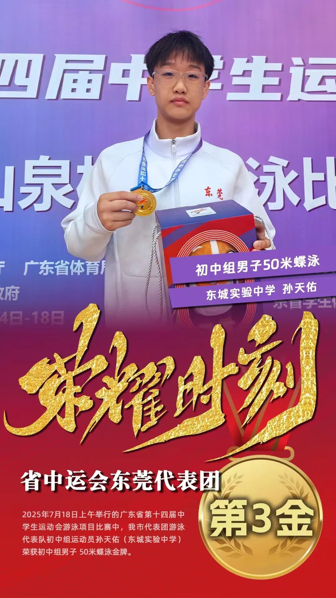 7月18日,东莞泳将乘胜追击。来自东莞市东城实验中学的孙天佑同学在初中组男子50米蝶泳决赛中技压群雄,以26秒27的优异成绩再次登顶,为东莞代表团贡献了宝贵的第三枚金牌!孙天佑的精彩表现为东莞游泳队的夺金之旅画上了圆满的句号。