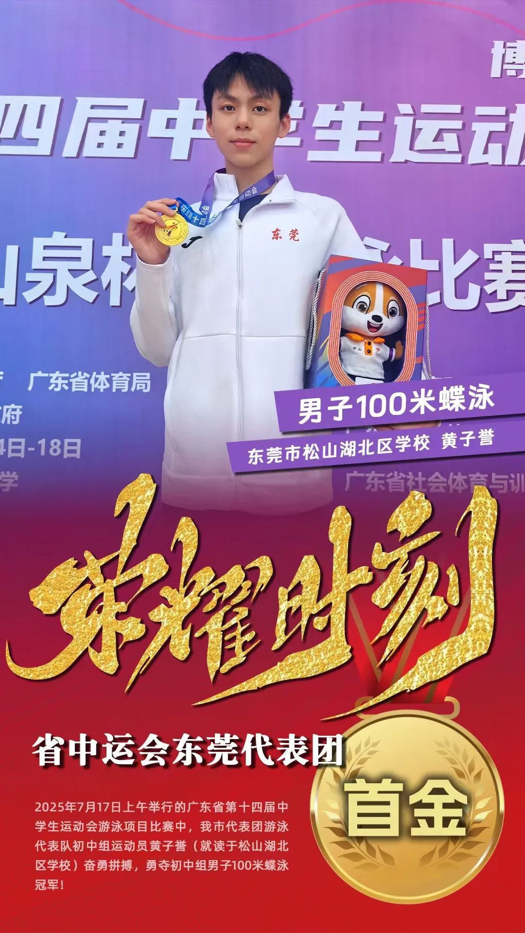 比赛首日(7月17日),来自东莞市松山湖北区学校的黄子誉同学便为东莞代表团迎来开门红。他在初中组男子100米蝶泳决赛中展现出绝对实力,以56秒34的优异成绩勇夺冠军,为东莞代表团摘得本届省中运会的首枚金牌!这枚金牌极大地鼓舞了全队的士气。