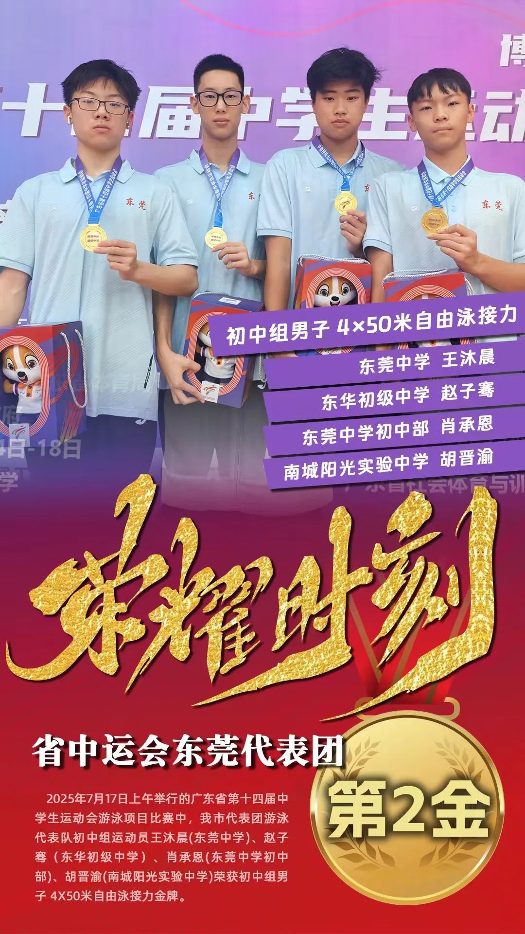 捷报频传!同日上午,在备受瞩目的初中组男子4×50米自由泳接力项目中,由王沐晨(东莞中学)、赵子骞(东华初级中学)、肖承恩(东莞中学初中部)、胡晋渝(南城阳光实验中学)组成的东莞接力队配合默契,发挥出色。他们顶住压力,以1分43秒37的绝对优势率先触壁,勇夺该项目金牌!这是东莞代表团在本届赛事中获得的第二枚金牌,充分展现了东莞游泳后备人才的整体厚度和团队协作精神。